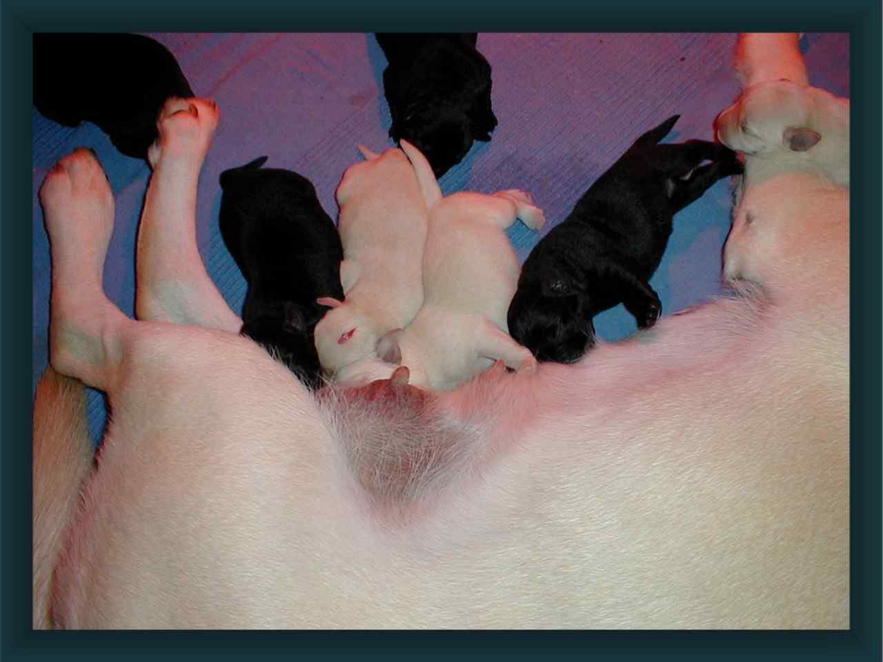 ...endlich ist es geschafft, alle acht Welpen sind geboren. Während unsere Wurfkiste sauber gemacht wird, schlafen wir schon mal'ne Runde. |