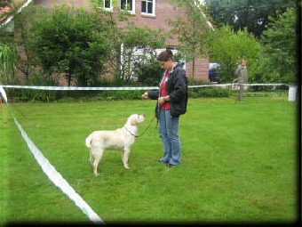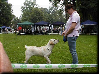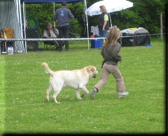 super gemeistert hat ... ...13 months old lovely yellow, nice head and super pigmentation, lovely reach of neck, good top line, correct tail and a good summer coat, enough angulation, moved well and was handled perfectly.....