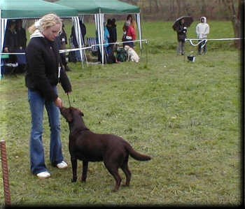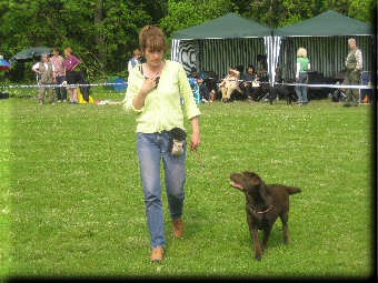 in der Zwischenklasse ein ...21 month old lovely choc, good head, sweet expression, good eye colour, lovely reach of neck, level top line and wageling tail, good quarters, moved and showed well ...