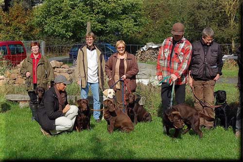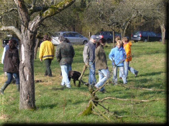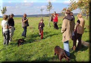 30.September 2007 Schnupperkurs Fährtenarbeit Bei schönstem Wetter haben sich heute 10 Hunde mit ihren Menschen in der Hundeschule der Familie Wissel getroffen um etwas über die Fährtenarbeit zu lernen. Herr Wissel hat uns ausführlich über die Funktionsweise und den Aufbau der Hundenase und deren Einsatz beim Suchen aufgeklärt. Auch über das Jagtverhalten des Hundes und die Biochemie der Fährte wurde gesprochen. Nach so viel Theorie haben wir uns erst einmal mit Salaten und Kuchen gestärkt, danach ging es raus ins Feld um das Ganze in die Praxis umzusetzen. Hier hat man schnell gemerkt, dass auch bei dieser Art der hundegerechten Beschäftigung nichts ohne Training geht . Ich fand es war ein schöner Tag , die Fährtenarbeit ist sicher eine tolle Möglichkeit seinen Hund sinnvoll zu beschäftigen . Vielen Dank an alle meine Hunde Familien für ihr Kommen und an Herrn Wissel für das Angebot diesen Kurs zu halten.