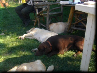 6.Mai 2007 F- Wurf Treffen Bei super Wetter haben sich heute 5 Hunde aus unserem F-Wurf , Mit dabei waren auch Mama Morlin und Oma Isis, die immer wieder versucht haben ihrem Nachwuchs Manieren beizubringen. Aber wie die Jungs halt in diesem Alter so sind, war es vergebens. Auch Papa Fozzy hat kurz vorbeigeschaut und seinen Nachwuchs für OK befunden. Unsere Mädchen Mira und Funny waren leider krank und konnten diesmal nicht dabei sein; gute Besserung an Euch !! Dackel Bodo ( 13 Jahre ) hat sich schließlich doch noch eine Bratwurst 'gefangen ' und war den restlichen Tag damit beschäftigt sie zu verdauen. Schön, dass Ihr dabei wart und ich die Bande mal wieder sehen konnte. Vielen Dank an Familie Wissel, die uns ihren Hundeplatz zur Verfügung gestellt und diesen Tag mit uns verbracht hat . |