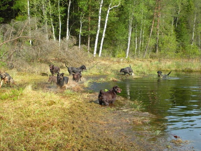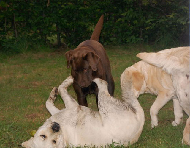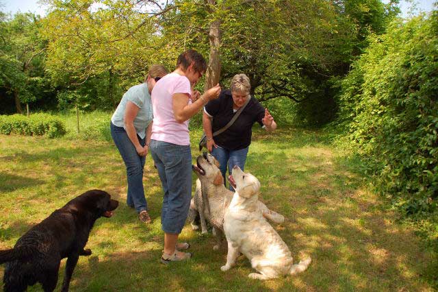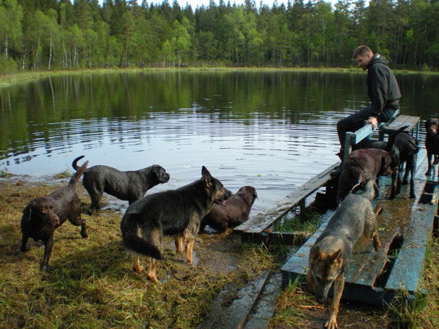 Heute haben wir uns getroffen....... wir- das sind Scully, Hope, Floyd ,Nele, Tay, Grace, Nelson, Morlin, Jack, Dayo, Sheila, Holly 1 und Holly 2, Bonnie und Kira und zwei Gasthunde !!! Bei schönem Wetter konnten wir uns herrlich austoben und auch die 'sehr gepflegte Teichanlage' wurde ausgiebig genutzt .Tay gefiel das so gut, dass er sich vor seinem Foto Shooting nochmal schnell badete, was sein Frauchen Connie komischerweise völlig aus der Fassung brachte........ Die anderen Herrchen und Frauchen haben es sich bei Steaks, Würstchen und Salaten gut gehen lassen und dabei immer wieder ganz stolz von 'ihren' Hunden und den Fortschritten bei der Erziehung berichtet.... und hier liegt wohl euer großer Irrtum...... Wir haben doch euch erzogen , oder ??!!!!