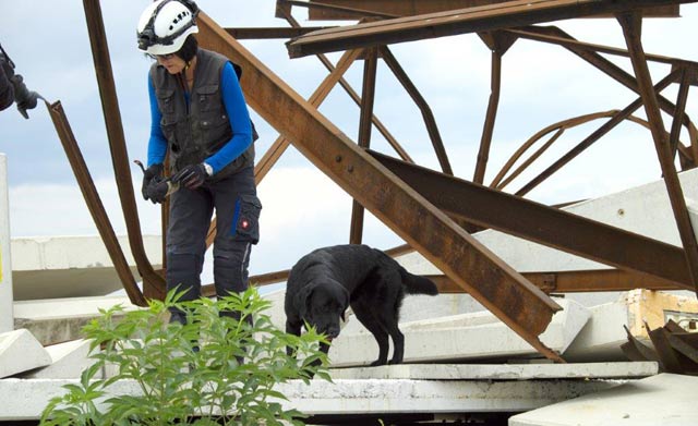 Aktivurlaub für Morla und Flinn Eine Woche Trümmertraining in Niederösterreich Die fast zweijährigeMorla ( Mexican La Ola of Sheppard`s Garden) befindet sich mitten in der Ausbildung zum Rettungshund in den Sparten „ Fläche“ und „ Trümmer “.Auf dem weitläufigen Trainingsgelände des Tritolwerks mit schweren Schadenstellen konnte sie neue Erfahrungen in der Trümmersuche sammeln. Allein die Begehung der Trümmer forderte Gewandtheit und Mut der teilnehmenden Hunde. Morla musste lernen ihre überschäumende Suchmotivation zu zügeln und mit Bedacht und Köpfchen nach den unter den Trümmern versteckten Personen zu suchen. Flinn (Final Fantasy of Sheppard`s Garden), erfahren im Flächeneinsatz, arbeitete mit seinen 10 Jahren in den leichteren Trümmerlagen. Die Ausbildung zum Rettungshund beginnt am besten bereits im Welpenalter mit Spiel und Kontaktaufnahme zu fremden Menschen. Es folgen Witterungsübungen im Gelände, das Etablieren einer Bestätigungsform (Beutespiel, Futter etc.) und der Aufbau einer Anzeige an der Versteckperson. Die gebräuchlichste Anzeigeform ist die Verbellanzeige. Nach etwa zwei bis drei Jahren regelmäßiger Übungen im Gelände, an der Lenkbarkeit, an den Geräten, sowie am Grundgehorsam, ( BHP) sind Hund und Hundeführer - auch der Hundeführer muss in dieser Zeit viel lernen - in der Regel soweit ausgebildet, dass sie als Team die Hauptprüfung ablegen können, je nach ausgebildeter Sparte als Flächenprüfung (FL) oder Trümmerprüfung(TR). Nur die erfolgreich geprüften Teams dürfen in den realen Einsätzen suchen. Flächen –und Trümmerprüfung müssen jährlich wiederholt werden. Morla, wird im Herbst, nachdem sie die BHP und die staffelinterne Vorprüfung „ Fläche“ bereits bestanden hat, zur Hauptprüfung „ Fläche“ antreten. Sie soll nach und nach Flinn bei den Einsätzen ablösen. Morlas Trümmerprüfung ist für das kommende Jahr vorgesehen.