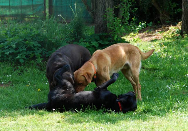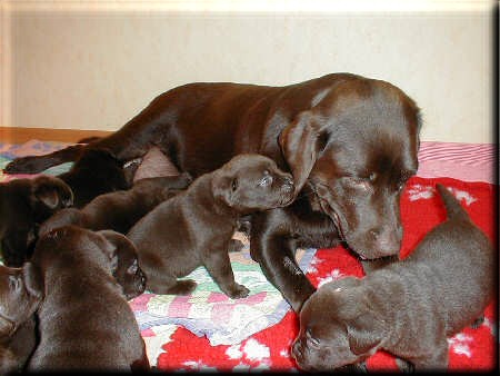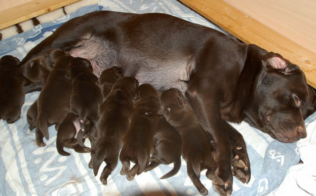 heute vor 14 Jahren wurde unser D- Wurf geboren, es waren 10 schokobraune Welpen Bei diesem Wurf kam mir das allererste Mal in den Sinn aufzuhören mit der Züchterei... es war unser erster Kaiserschnitt ( irgendwie hatte man immer Angst davor )... die Welpen hatten alle den Zwingerhusten, wir wussten nicht woher, Besucher waren in den ersten 4 Wochen noch nicht da und keiner der erwachsenen Hunde zeigte irgendwelche Symtome, und wir hatten einen Welpen mit einer angeborenen Anomalie, der Welpe ist dann mit 9 Wochen operiert worden und bei uns geblieben...alles in allem war es eine wirklich spannende und lehrreiche Zeit damals.