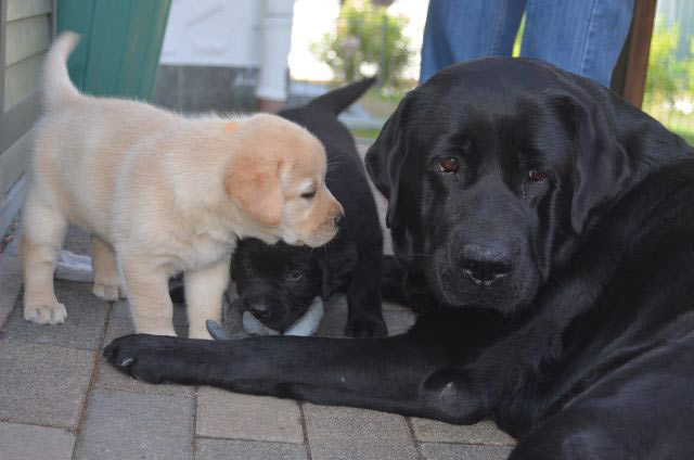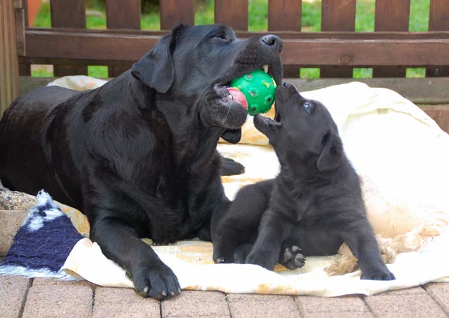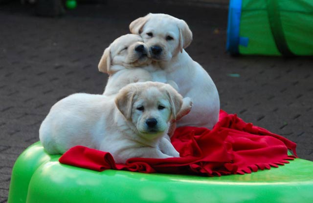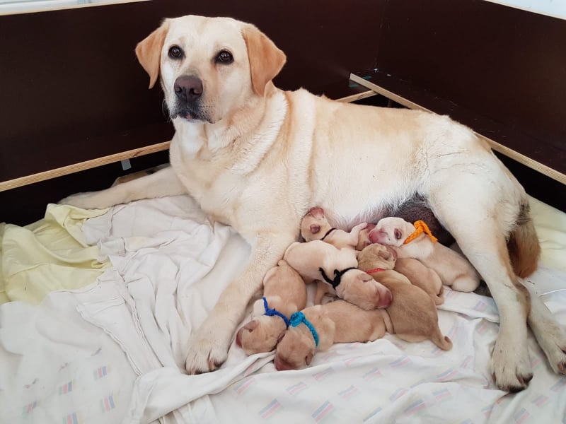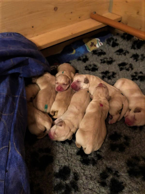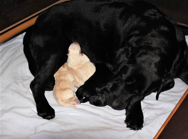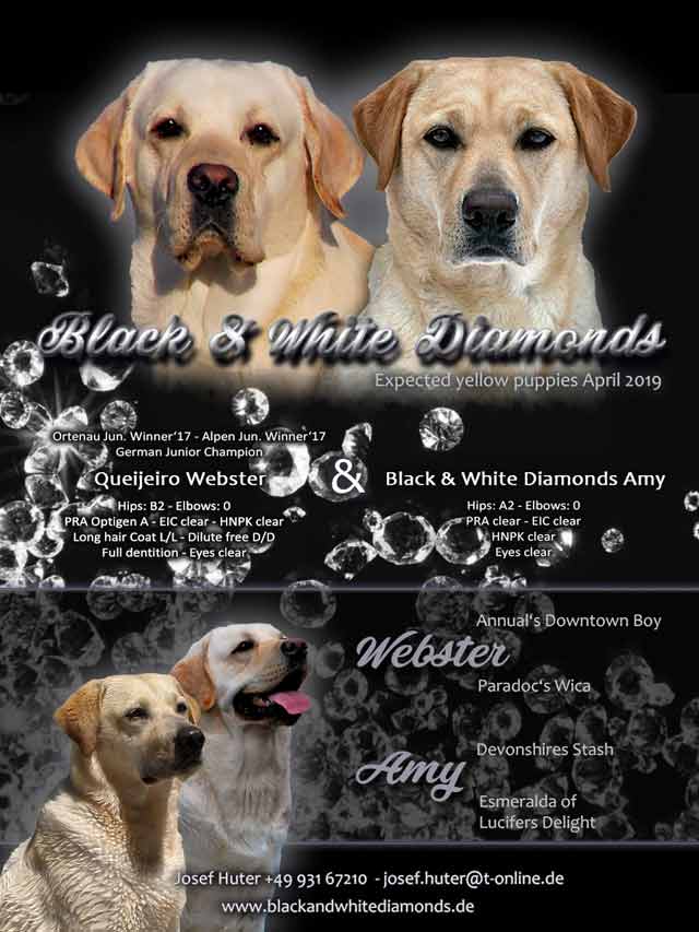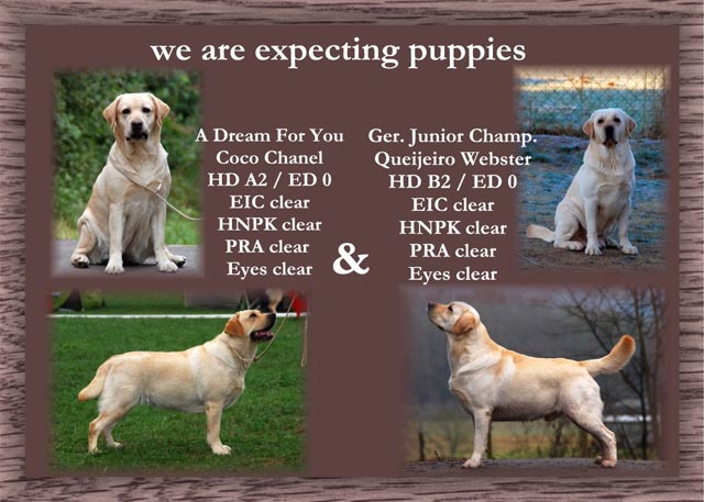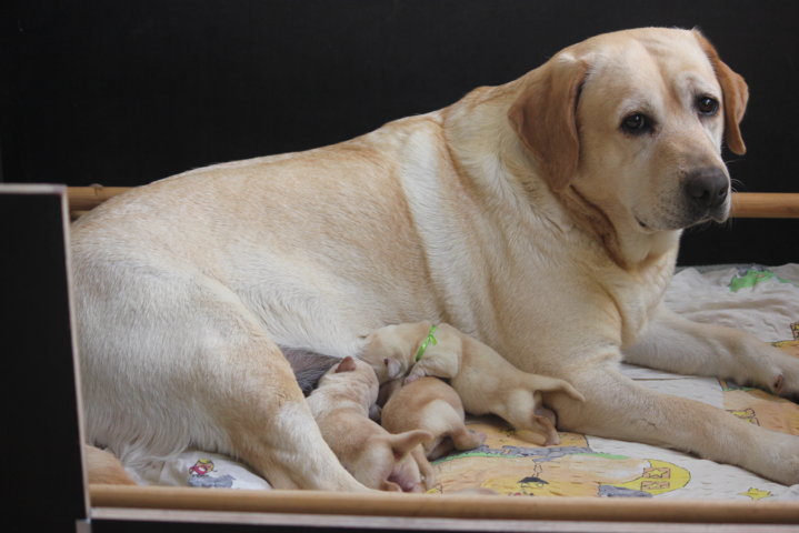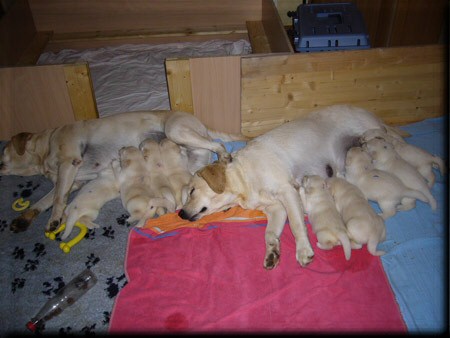 wir freuen uns riesig über die Geburt von 2 gelben Rüden und 5 gelben Mädchen Der Vater des Wurfes ist unser Webster , die Mutter ist Black And White Diamonds Amy . Amy hatte eine problemlose Geburt und ich hoffe dass auch die nächsten Wochen so entspannt verlaufen. Ich freue mich schon sehr auf meinen Besuch