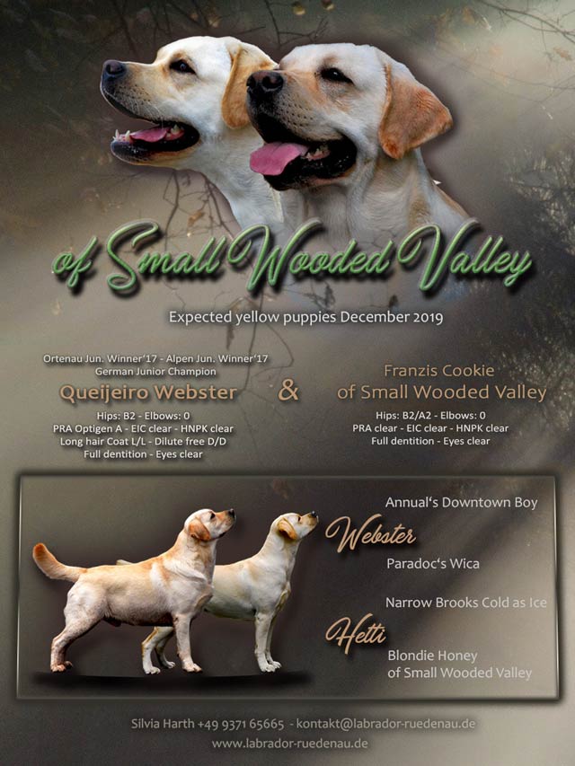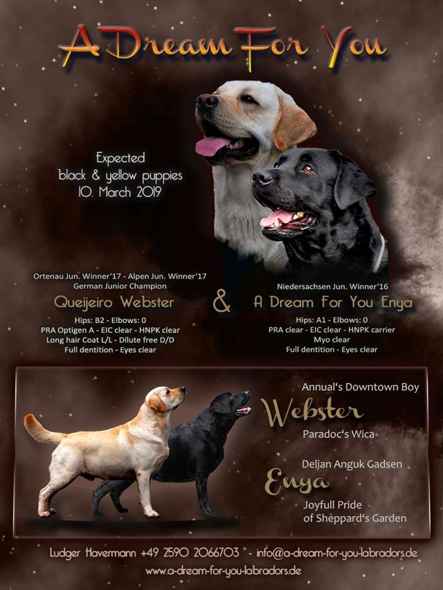 Aus dem Wurf von Webster und Enya ist aktuell wieder eine gelbe Hündin frei geworden. Bitte wenden Sie sich an Herrn Ludger Havermann Telefon: +49 2590 2066703 |